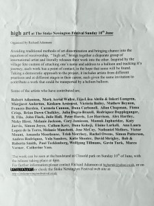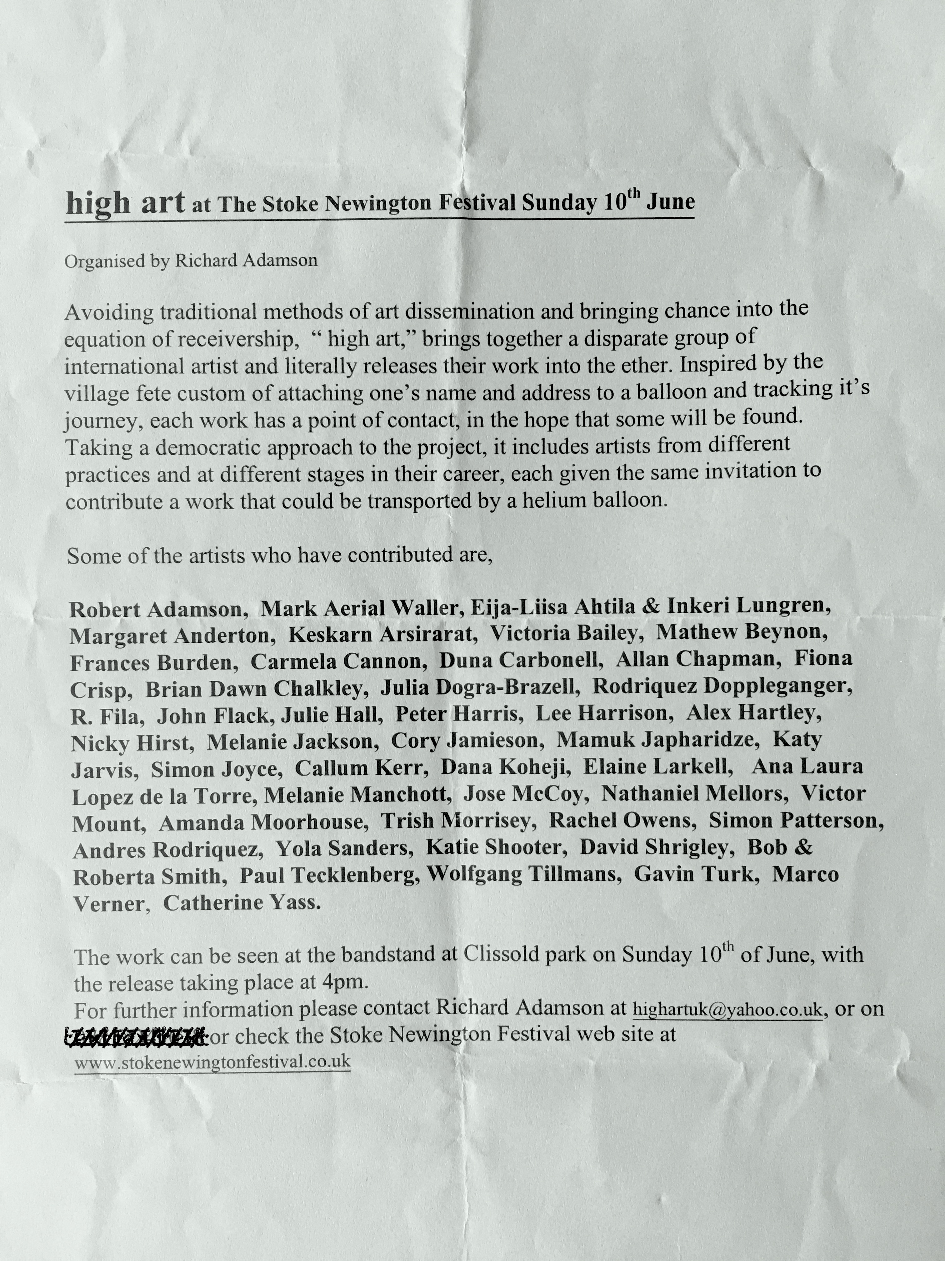 Audio work made after a total eclipse of the sun in 1999. Released into the sky 10 June 2001 at 4.00pm Clissold Park, London as part of ‘High Art’ at the Stoke Newington Festival. Voiceover is a sound picture. It consists of a narrative told in vivid, visual language; the story of something ungraspable that seems important yet inconclusive; a detached and ambiguous detail that invites the listener to form an ‘after image’ of an impossible photograph.