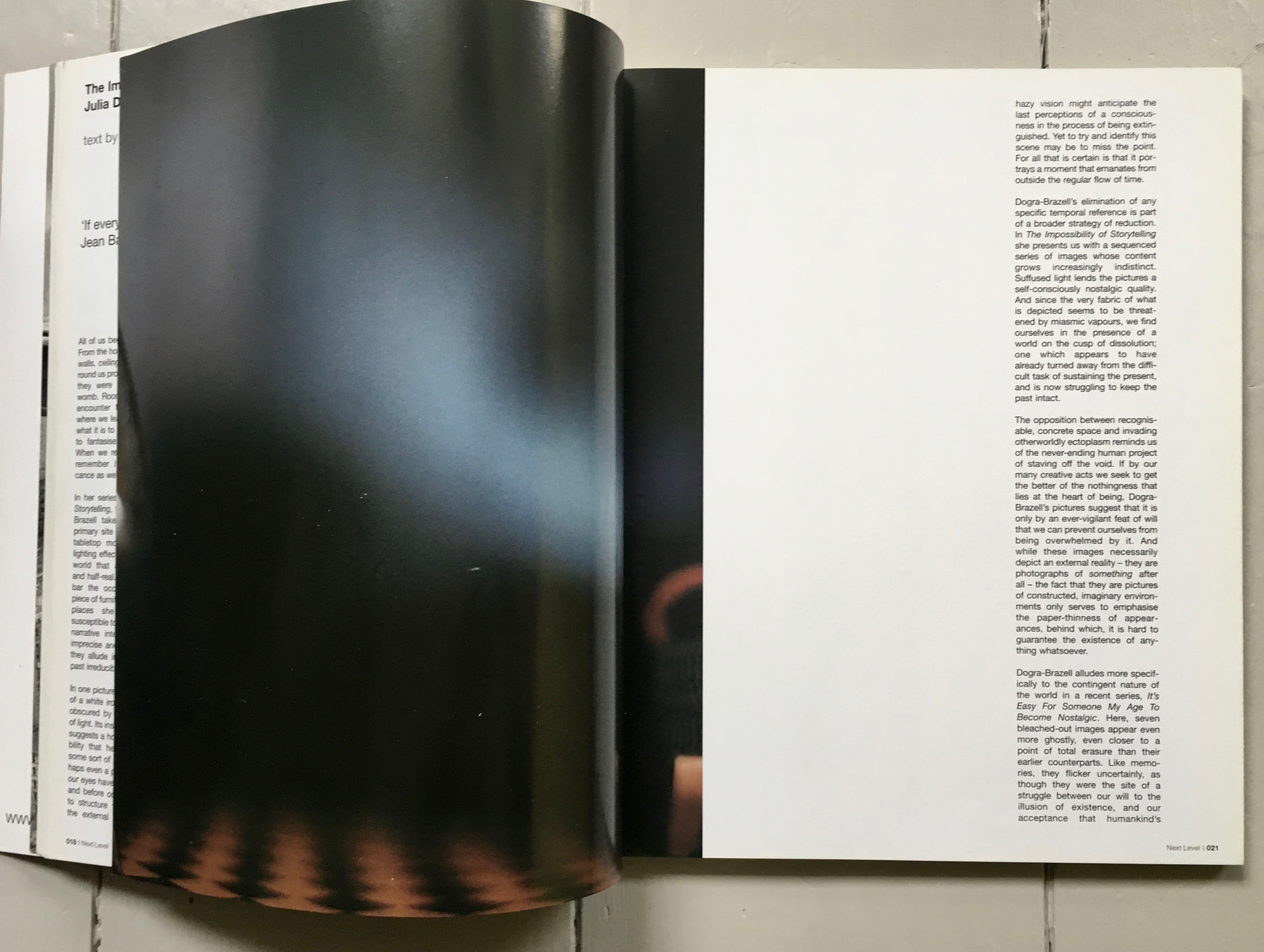 The opposition between recognizable, concrete space and invading otherworldly ectoplasm reminds us of the never-ending human project of staving off the void. If by our many creative acts we seek to get the better of the nothingness that lies at the heart of being, Dogra-Brazell’s pictures suggest that it is only by an ever-vigilant feat of will that we can prevent ourselves from being overwhelmed by it. And while these images necessarily depict an external reality – they are photographs of something after all – the fact that they are pictures of constructed, imaginary environments only serves to emphasise that paper-thinness of appearances, behind which, it is hard to guarantee the existence of anything whatsoever.