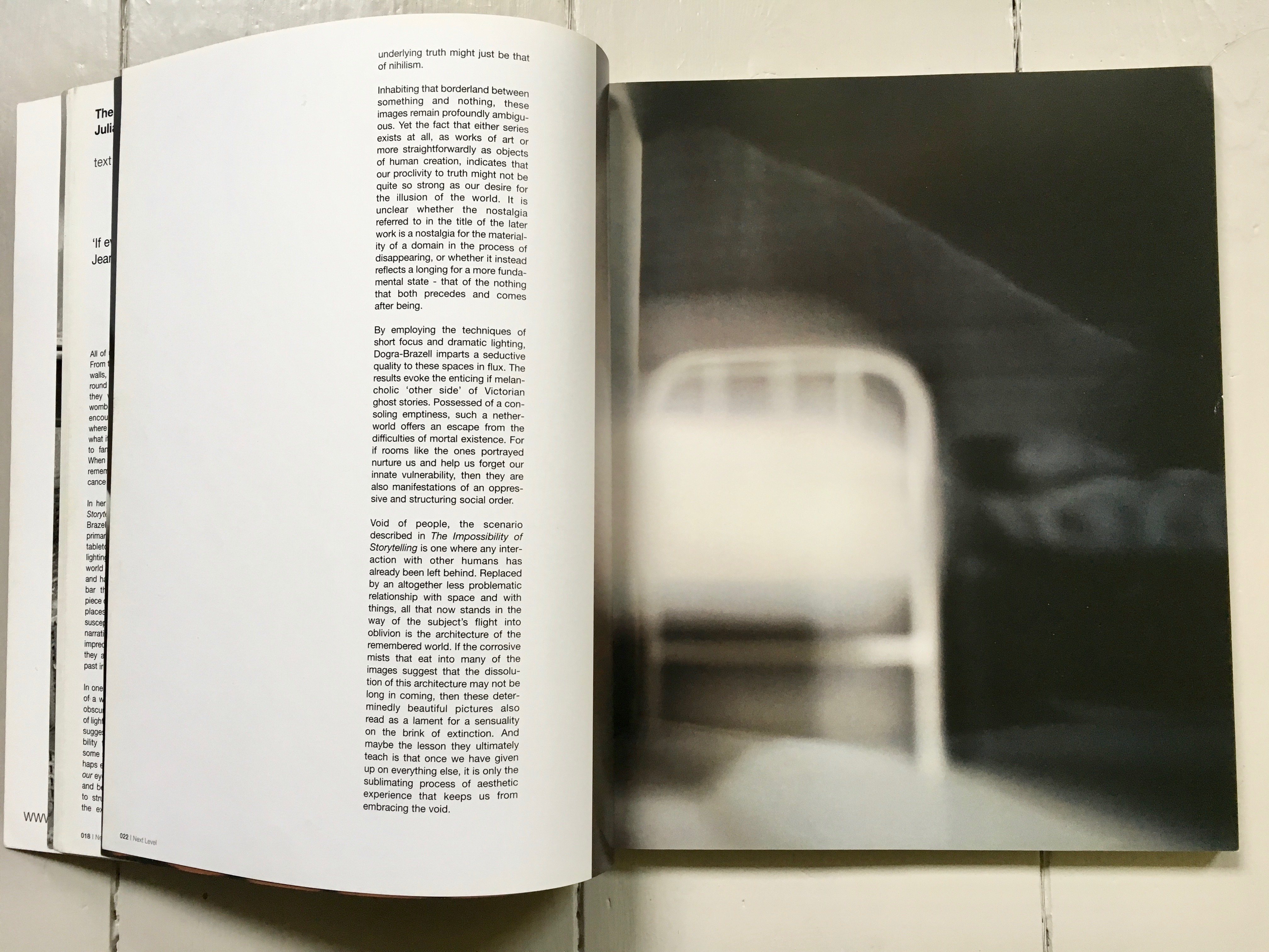 By employing the techniques of short focus and dramatic lighting, Dogra-Brazell imparts a seductive quality to these spaces in flux. The results evoke the enticing if melancholic ‘other side’ of Victorian ghost stories. Possessed of a consoling emptiness, such a netherworld offers an escape from the difficulties of mortal existence. For if rooms, like the ones portrayed, nurture us and help us forget our innate vulnerability, then they are also manifestations of an oppressive and structuring social order.